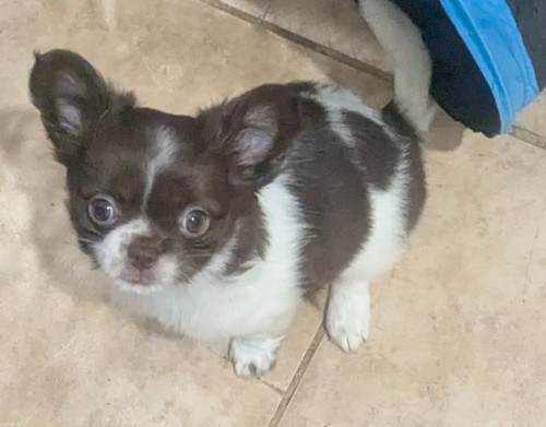 Meet Faith , a stunning exclusive beautiful apple head Chocolate n White Long coat female chihuahua.