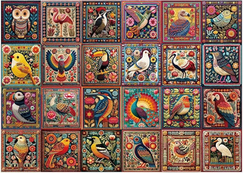 This puzzle features a delightful collection of birds rendered in a beautiful, textured tapestry. Delight in 24 crochet-style bird designs in square panels with colorful floral and decorative backgrounds. Includes owls, flamingos, parrots, peacocks, puffins, toucans, cranes and more, all with a rich and warm handmade look. The soothing colors and intricate details provide a wonderfully relaxing and engaging experience. Made of three-layer cardboard and precisely cut for a snug fit, it makes for a suitable gift for friends who are bird watchers or craft enthusiasts. Perfect for a quiet night in, a weekend project or a fun family activity, this stunning artwork also makes for a lovely and unique piece of home decor.