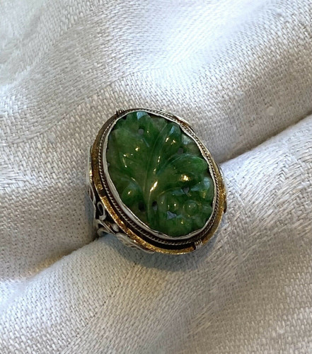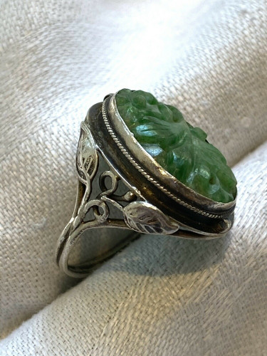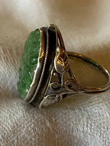 Notes: Beautiful, vintage possibly antique silver Arts & Crafts carved jadeite ring. Please see photos for design and condition details and note the lovely piece of carved green and light green jadeite bezel set in ring and note the bezel hugs contours of jade. The jadeite is slightly lighter than photos.