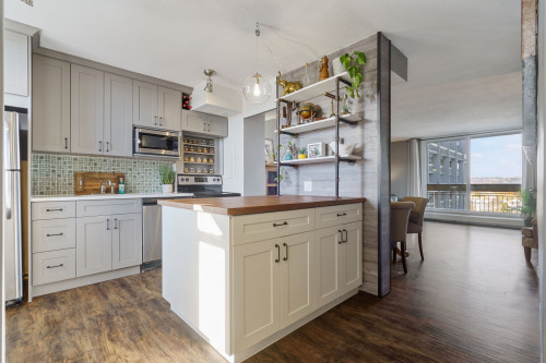 • Custom open-concept kitchen with quartz and butcher block counters, soft-close cabinets, a large island, glass tile backsplash, and a full-height pull-out pantry.