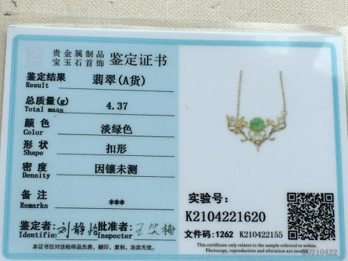 Certified natural A grade jade Light green Jadeite fine lucky pendant 1620
