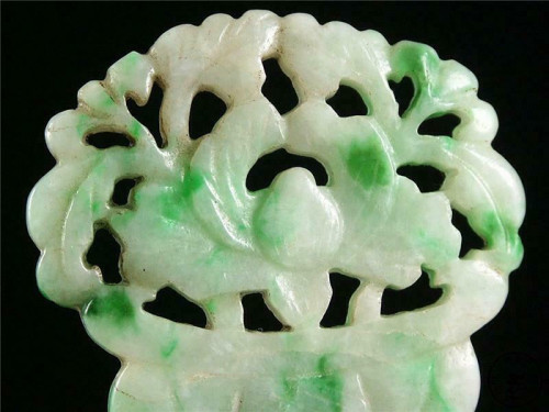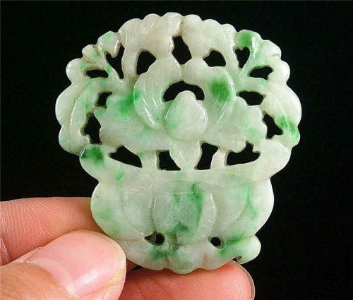 Antique Old Genuine Chinese Jadeite Emerald Jade Carved Pendant Netsuke. Designed with flowers in a basket, which is the symbol of flourishing. Very auspicious motif. The carving is simple but unique and exquisite. The craftmanship is very elegant as you can see from the pix. Nice glossy polish. The condition is old but very good. It will be a good gift as well as a cute collection.