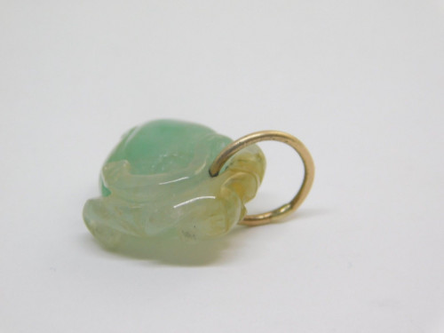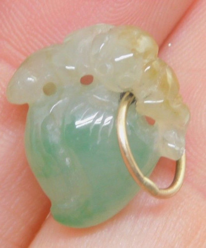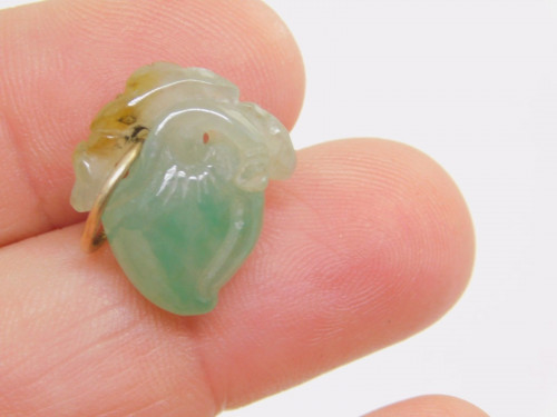 You are bidding on a 14k Yellow Gold Carved Green/Yellow Jadeite Jade Peach Design Pendant that weighs 3.0 grams and is 7/8" long including the bale. On the inside of the bale, it is marked 14k 585 with a makers mark that I cannot make out what it says.