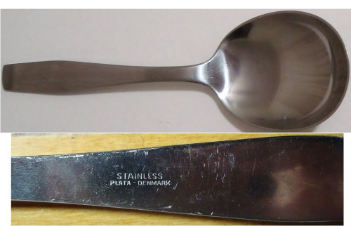 Pic 4) Georg Jensen of Denmark, Plata salad spoon. Stainless, 8.5" long. Scratched up from use, but they all are, from the few I could find. Seems they're from the 1930's or so. A specialty site had these for $59.99-$94, but actual sales elsewhere for the 1-2 I could find were in the mid-$30+ range. REDUCED, now...$15