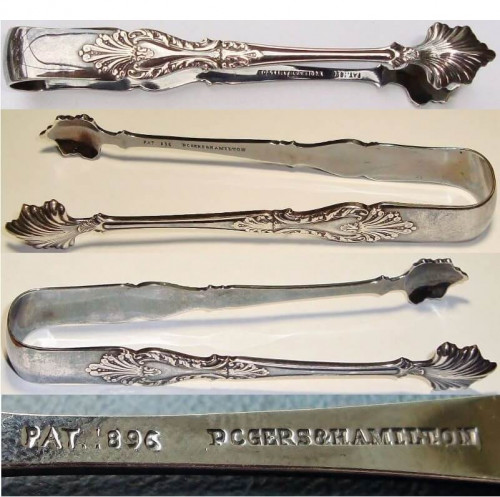 Pic 5) 4.25" Silver plated sugar tongs by Rogers & Hamilton, circa 1896. Raphael pattern. No dings, bends or scratches. Polished up ok, but there is some burnishing and edge wear of the silver plate. Manufacturer stamp didn't strike well, so it reads 'PCGERS' instead of ROGERS, and the 1 in 1896 is just a couple dots. Found these online from $25 to $50 and higher. REDUCED, now...$10