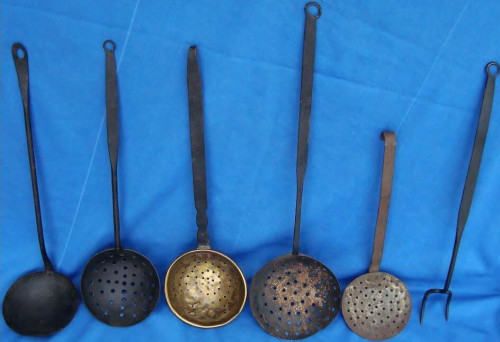 2) Perforated iron skimmer/strainer, 17 1/4" long, 'bowl' is 4 3/4" wide. Eye hook hanger. Heavier duty than 1st one, also good condition.