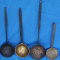4) Iron strainer/skimmer, 20" long, bowl is 5.5" wide, thin metal. Eye hook hanger. Fair amount of the black finish is off.