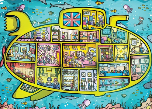 This "British Invasion Beneath the Waves" is your gateway to an enchanting underwater world, masterfully depicted in a 1000-piece jigsaw puzzle. Be transported to a retro-60s universe inside a yellow-colored submarine. Dive into scenes of underwater concerts, hippie gatherings, and vintage rooms, all surrounded by fascinating sea life. Imagine piecing together the intricate details of mermaids, dolphins and the colorful submarine interior, creating a masterpiece that bursts with nostalgic charm. Each piece of this puzzle is designed to challenge and delight, making it a perfect addition to your collection.