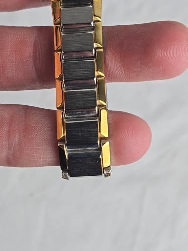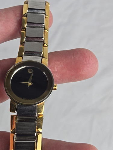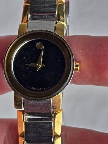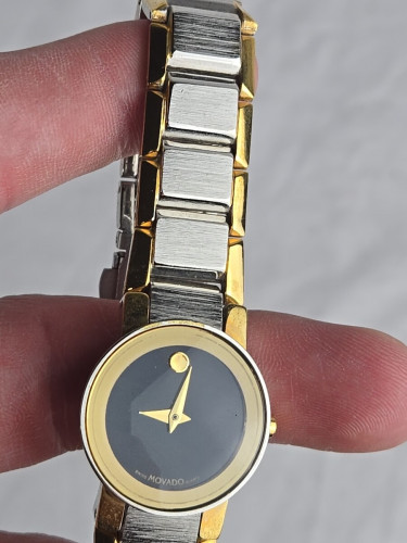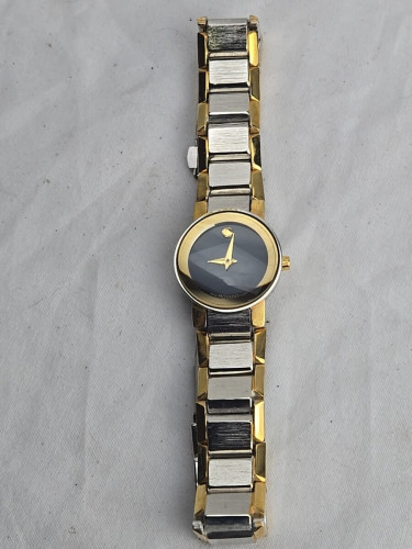 The Movado Two-Tone Gold Black Dial Women's Bracelet Watch is a stylish and elegant timepiece perfect for dressy occasions. With a sleek black dial and gold accents, this Swiss-made watch exudes sophistication. The quartz movement ensures accurate timekeeping, while the bracelet band adds a touch of luxury. The watch is water-resistant up to 30 meters, making it practical for everyday wear. Ideal for women who appreciate high-quality craftsmanship and timeless design.