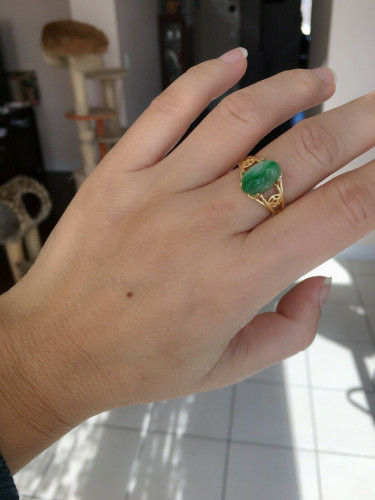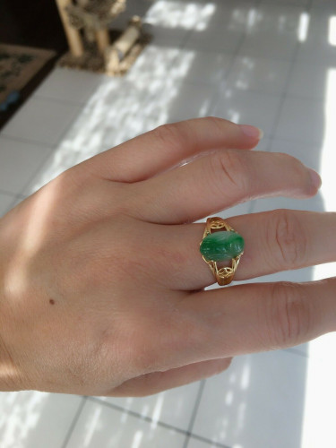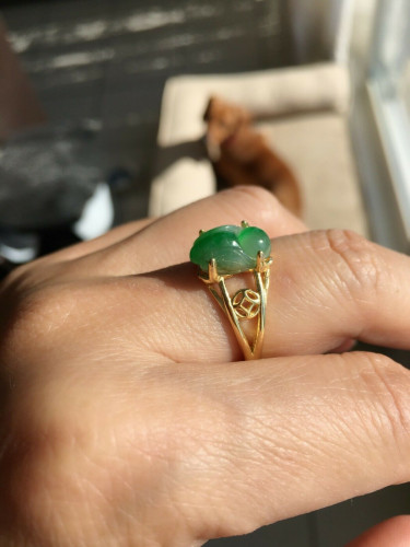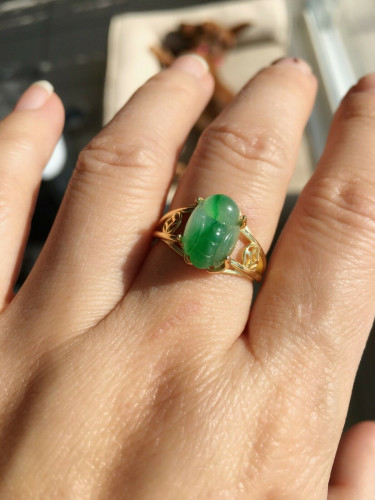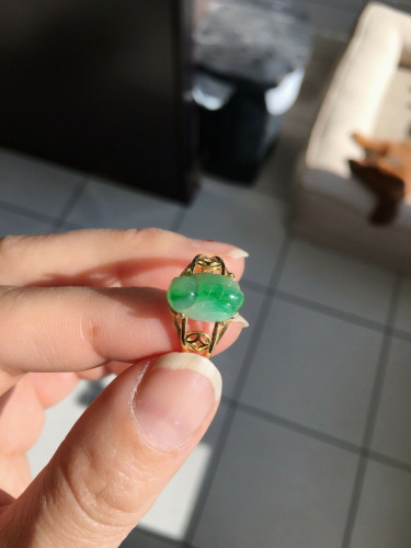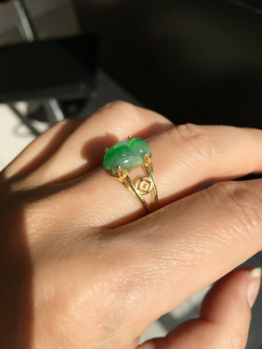 Here comes a beautiful Grade A Jadeite Jade sterling silver 18K gold plated ring. This shimmering ring is crafted from 3.0carats (ctw) of natural Grade A Jadeite Jade . Jade is in very nice transparent apple green. It has very fine texture with juicy feel which is the finest grade of jadeite standard . it is very well carved to a vivid cicada, even the cicada eyes and wings are exquisitely carved.