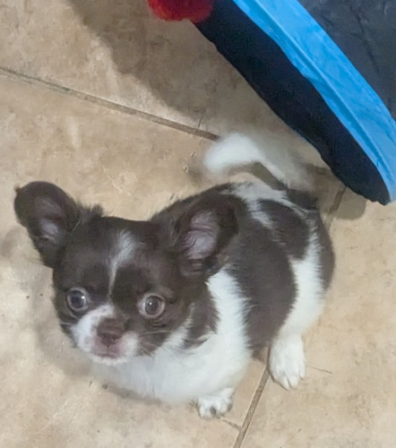 Meet Faith , a stunning exclusive beautiful apple head Chocolate n White Long coat female chihuahua.
