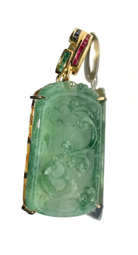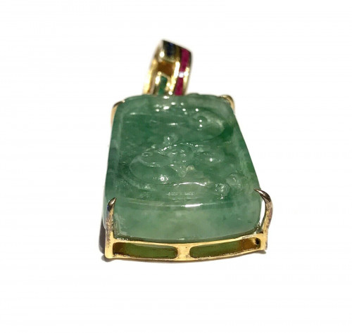 Vtg Signed Gilt 925 Sterling Carved Fish Jade Pendant Emerald Sapphire Ruby