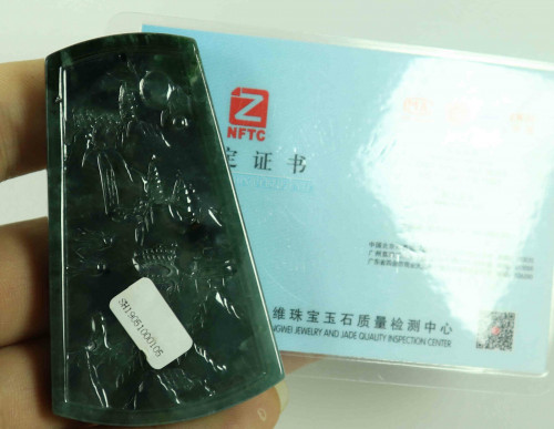 Cert'd Dark Green Natural A JADE jadeite Two-sided Carved Pendant 山水 1898-2