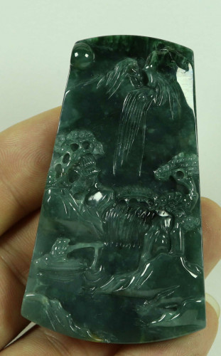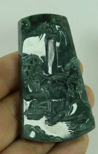Cert'd Dark Green Natural A JADE jadeite Two-sided Carved Pendant 山水