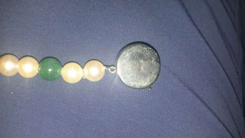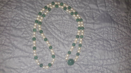 Vintage long jadeite and pearl necklace, silver clasp