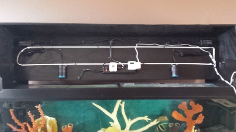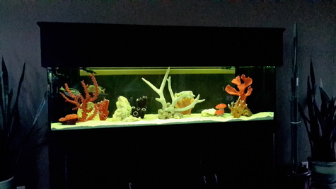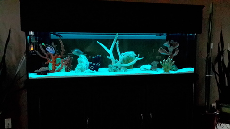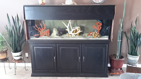Custom Base and canopy for 125 gal aquarium. Black oak. Base is 36" high, 19" deep and 6 feet long. Canopy is roll top design for easy access to top of aquarium. Roll top is 12" high. Three front access doors for full access to all equipment in the base. Aquarium and canopy lighting pictured ARE NOT INCLUDED in price. Custom LED with 12 colors and dimmer and Kessil 150 watt LED lights may be available for 225.00 additional.