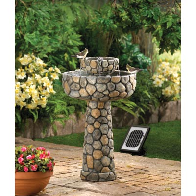 Grace your garden with rustic romance and the music of flowing water! Elegant faux cobblestone fountain features the convenience of two power options: Solar panels for cord-free enjoyment, or an optional electrical plug for shady locations or overcast days.