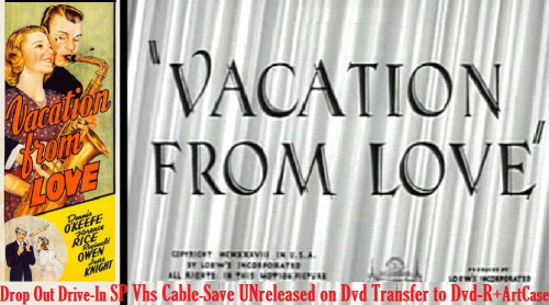 "Vacation from Love" (1938){Dvd-R} I'm offering a transfer to Dvd-R of my SP Vhs save, from channel that aired movies commercial free (VIEW SCREEN CAP PICS :) of this UNreleased on dvd classic film rarity, sent in dvd slimcase w/simple artsheet insert. Cost of media Mail shipping includes USPS Signature Confirmation tracking which will require package be signed for.