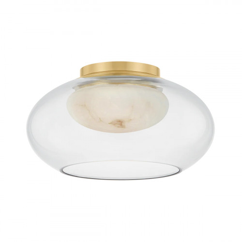 Moore stuns in its simplicity. Available in two sizes, this nested flush mount design features an outer clear glass shade that reveals alabaster within. The double layer gives the fixture an elevated, graceful presence that creates a warm diffusion of light. Finished in Aged Brass, the metalwork of Moore adds a timeless, luxurious note that complements any design style.