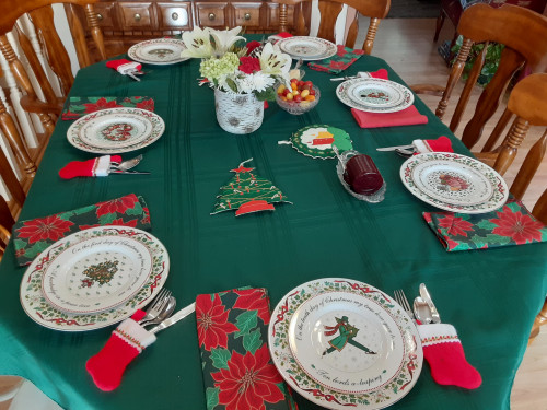 I set the table with the dessert plates on top of the dinner plates.