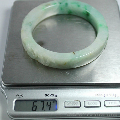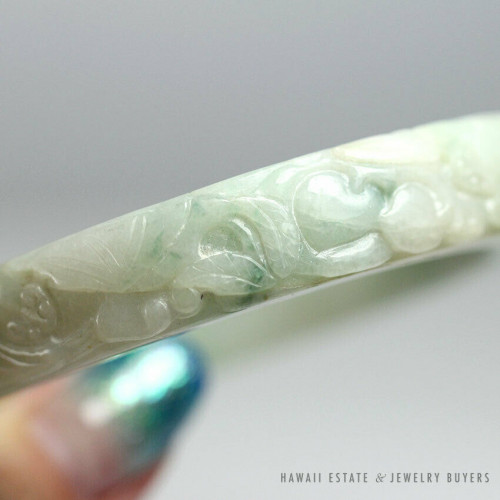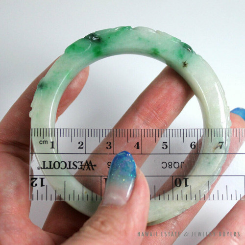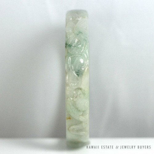 VINTAGE JADE GREEN WHITE GREY CARVED BAT FRUIT 12MM FLAT BANGLE