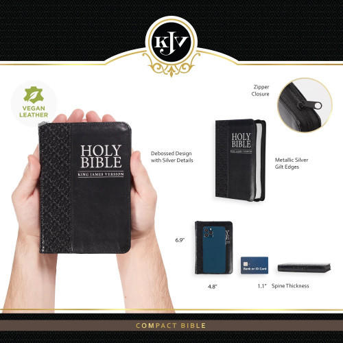 This Black Faux Leather KING JAMES VERSION HOLY BIBLE with zippered closure is the perfect bible to slip into a purse! The zippered closure protects the pages inside the Bible so they will not fold or tear. The black faux leather back panel of this Bible features an uninterrupted heat-debossed quatrefoil design. The panel wraps around the spine and connects to a smooth front panel that holds the silver-foiled title and version reference. The edges and seams of this KING JAMES VERSION HOLY BIBLE are reinforced with black topstitching. Silver gilt-edged pages complement the silver-foiled title and a black satin ribbon marker is included to save your place. A sturdy black zipper with a silver pull closes you Bible securely. This Bible opens flat for easy reading and, once opened, you will find reader-friendly subheadings, a double-column format, words of Christ printed in red ink, a thematic Scripture verse finder, and a one-year Bible reading plan.