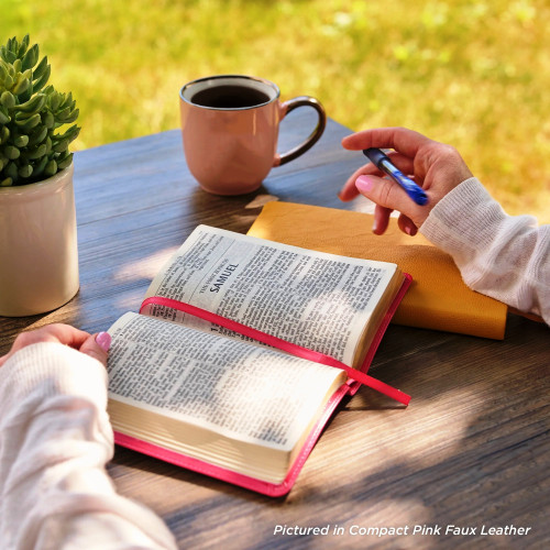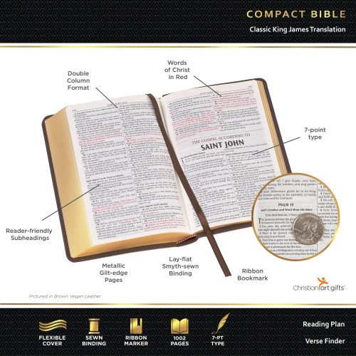 • Large Print: 10-point type text, considered large print for a compact Bible.