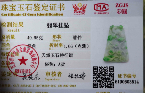 This item that we are selling is 100% natural Grade A jadeite (fei cui) jade, without any artificial dyeing, and send with the certificate.