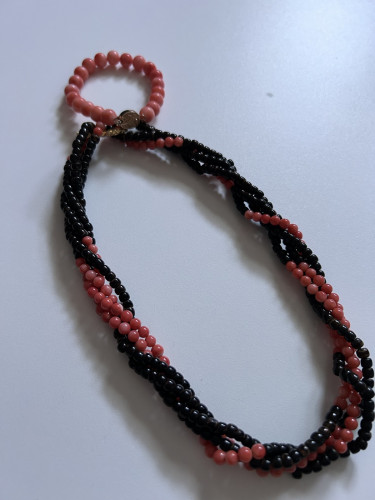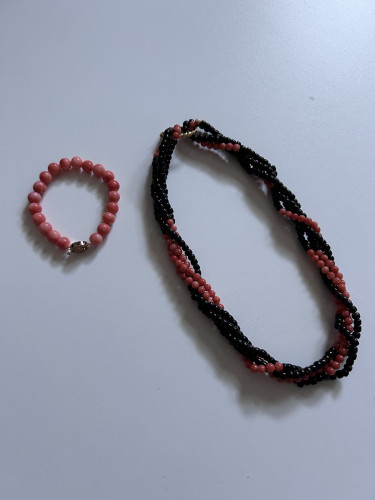 Necklace and bracelet set, natural pink & black coral beads, sterling silver