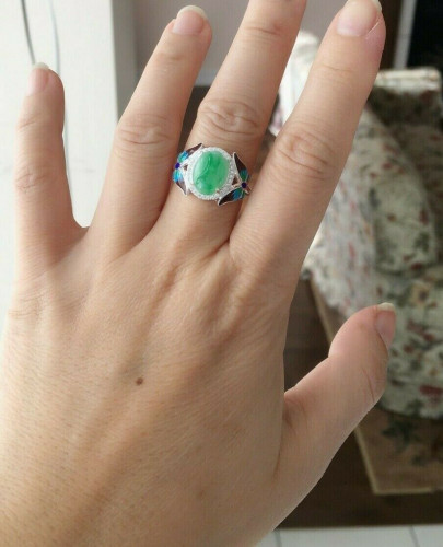Grade A Jadeite Jade Hand Carved Cicada in Enamel Butterfly Sterling Silver Ring