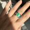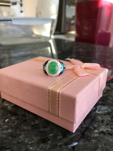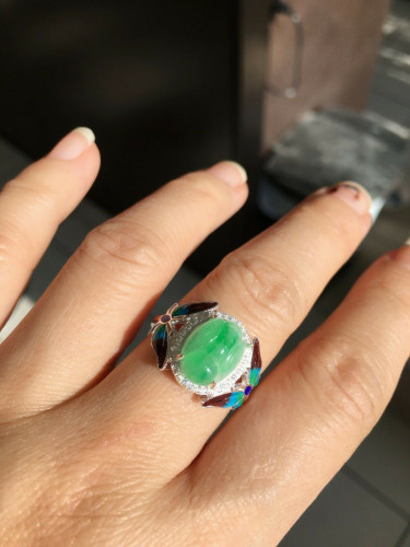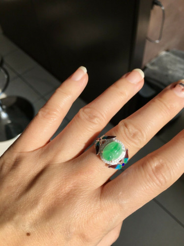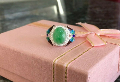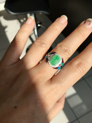 Here comes a beautiful Grade A Jadeite Jade sterling silver 18K white gold plated enamel ring. This shimmering ring is crafted from 3.2 carats (ctw) of natural Grade A Jadeite Jade . Jade is in very nice transparent apple green. It has very fine texture with juicy feel which is the finest grade of jadeite standard . it is very well carved to a vivid cicada, even the cicada eyes are exquisitely carved. The jade cicada shines from the center surrounded by twinkling diamond-like AAAAA grade cubic zirconia .