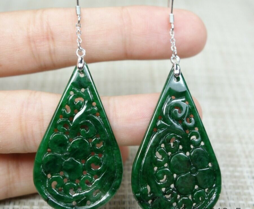 Certified Green 100% natural A jadeite jade Earring S925 Silver 镂空雕花耳坠