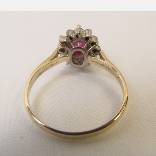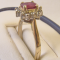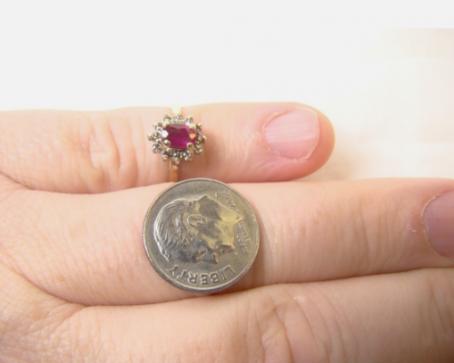 This is a gorgeous ring, it would make a wonderful cocktail, party, engagement, statement or every day ring. It has a genuine natural .25 ct oval cut ruby surrounded by 12 round cut genuine diamonds. All of the stones really sparkle, this ring is an eye catcher. The setting is genuine 14 k yellow gold. The whole thing weighs a total of about 2.2 g.